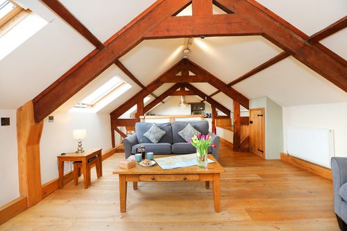 - Oak flooring and stairs with exposed beams